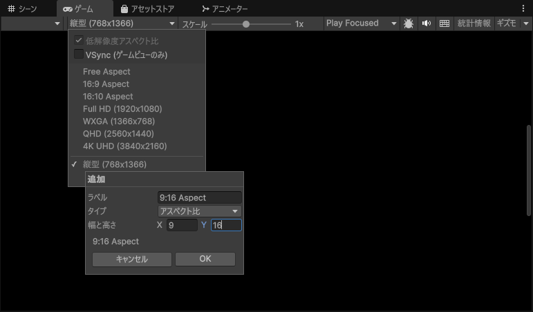 ゲーム画面で縦横比を調整します。Free Aspectとなっているところをクリックすると様々な解像度を選ぶことができます。しかし、縦型の画面は選択肢にないので新しく作ります。「追加」をクリックして、ラベルを「9:16 Aspect」、タイプを「アスペクト比」、幅と高さをXは9、Yは16に設定してOKを押します。