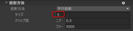 MainCameraを選択して、インスペクタの「投影方法」から「サイズ」を「10」にします。また、背景が青いのを黒にしたいので、「環境」の「背景タイプ」を「ソリッドカラー」にして「背景」は黒にします。